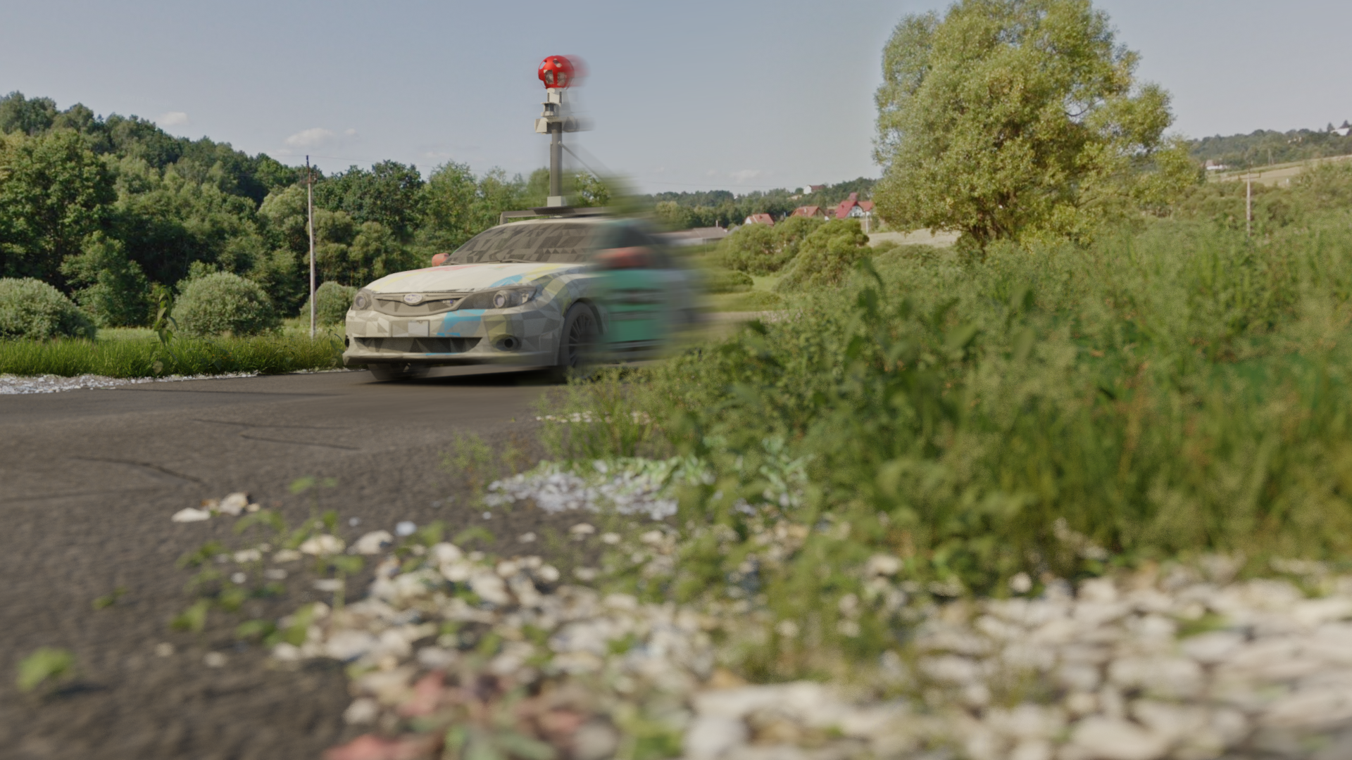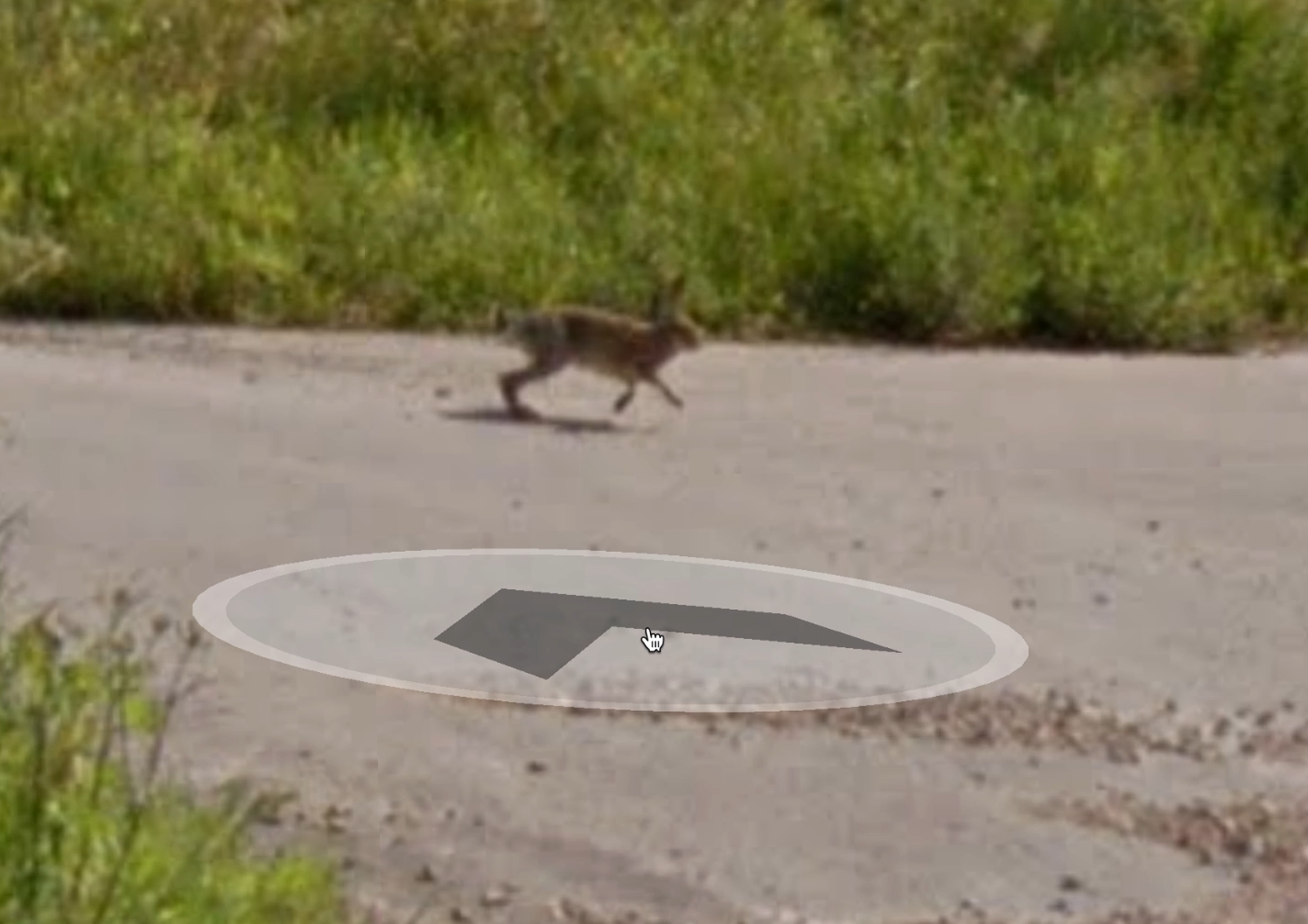 On a sunny summer day a European hare crossed the Polish country road "Białą Drogą". It was hit by a Google street view car mapping the area, which catapulted the hare into the air. The car documented the crash with its 360° camera rig and the flying hare found itself on Google Street view.