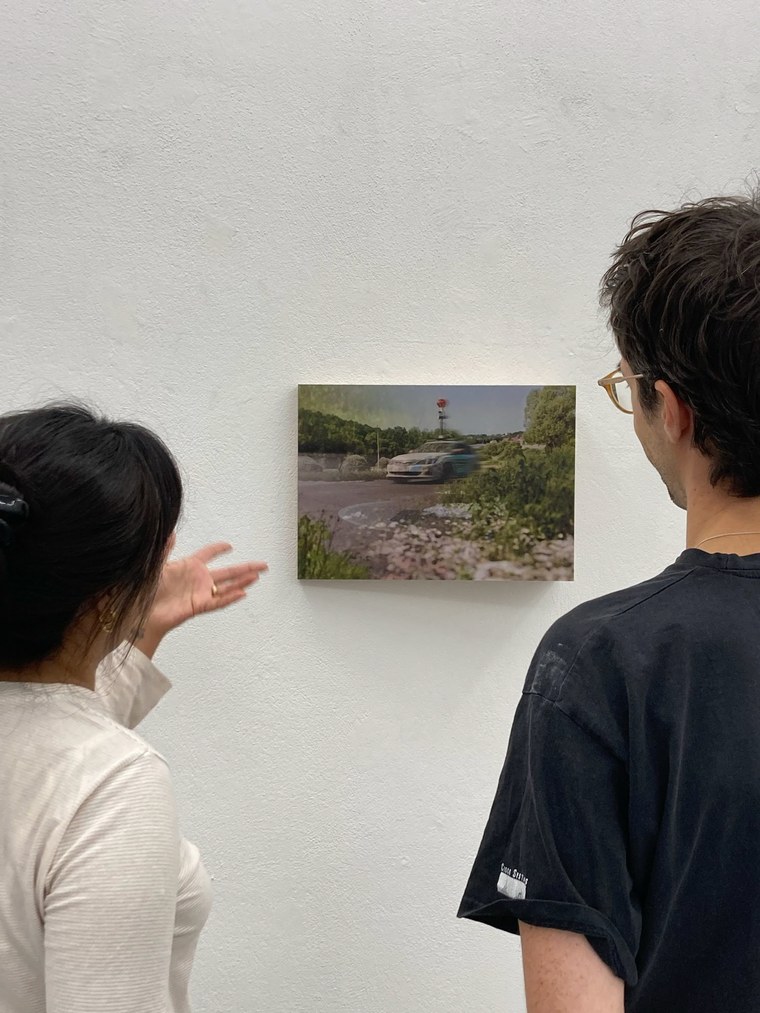 The images are printed as lenticular prints and mounted on angled wooden corpuses. Viewed from the left the three images depict the hare out of the car's perspective. Viewed from the right the hare's point of view is visible.
