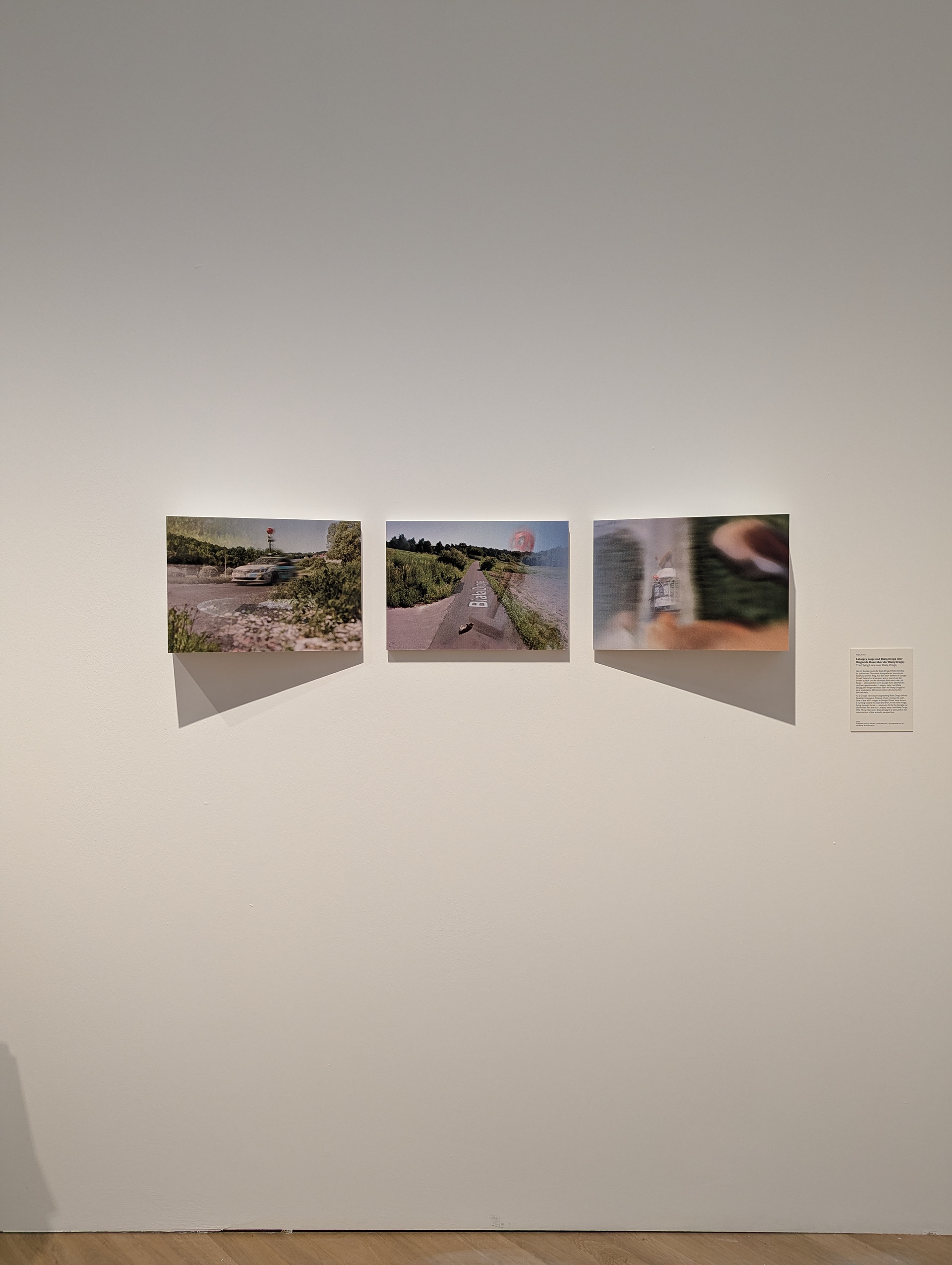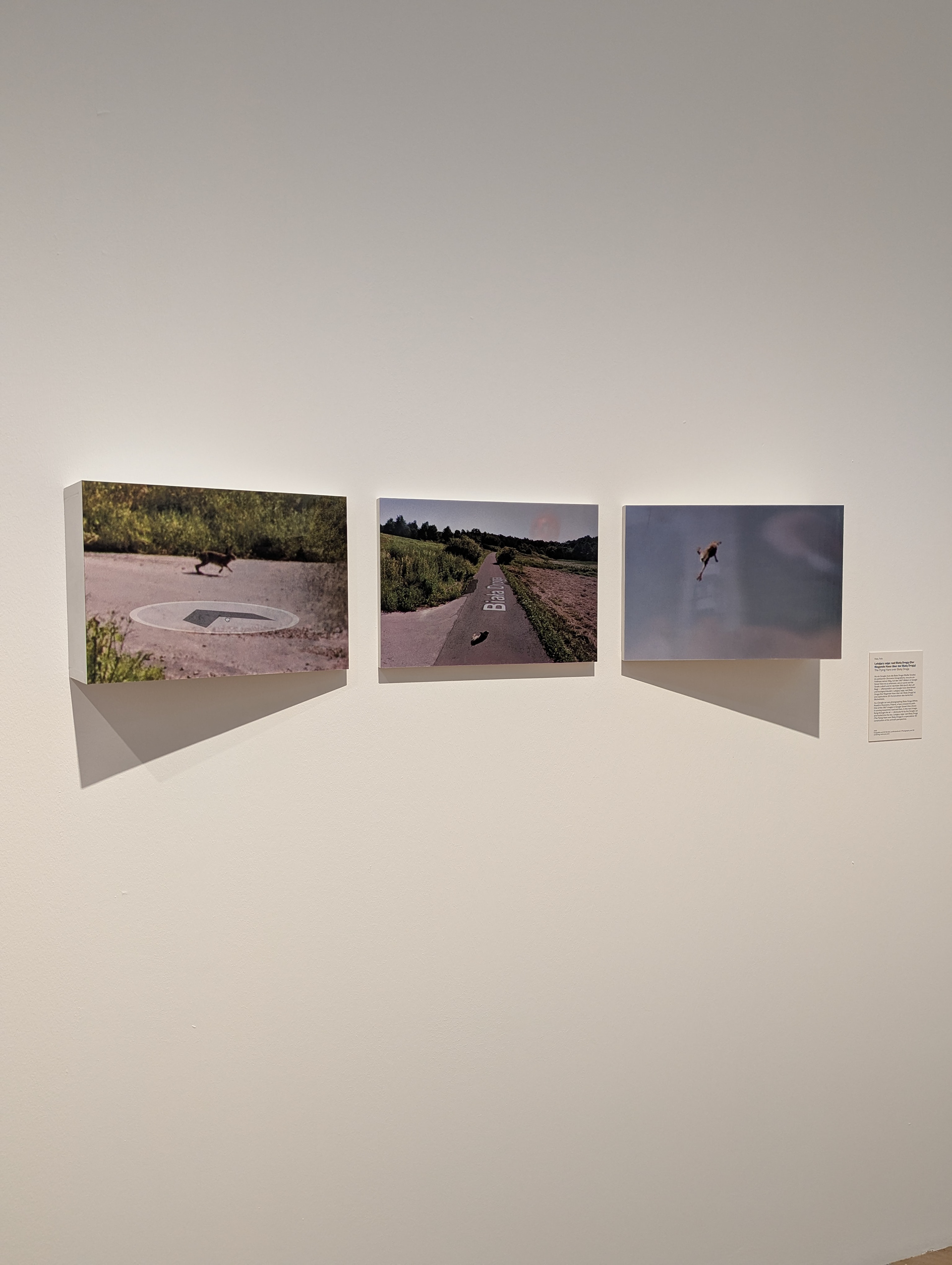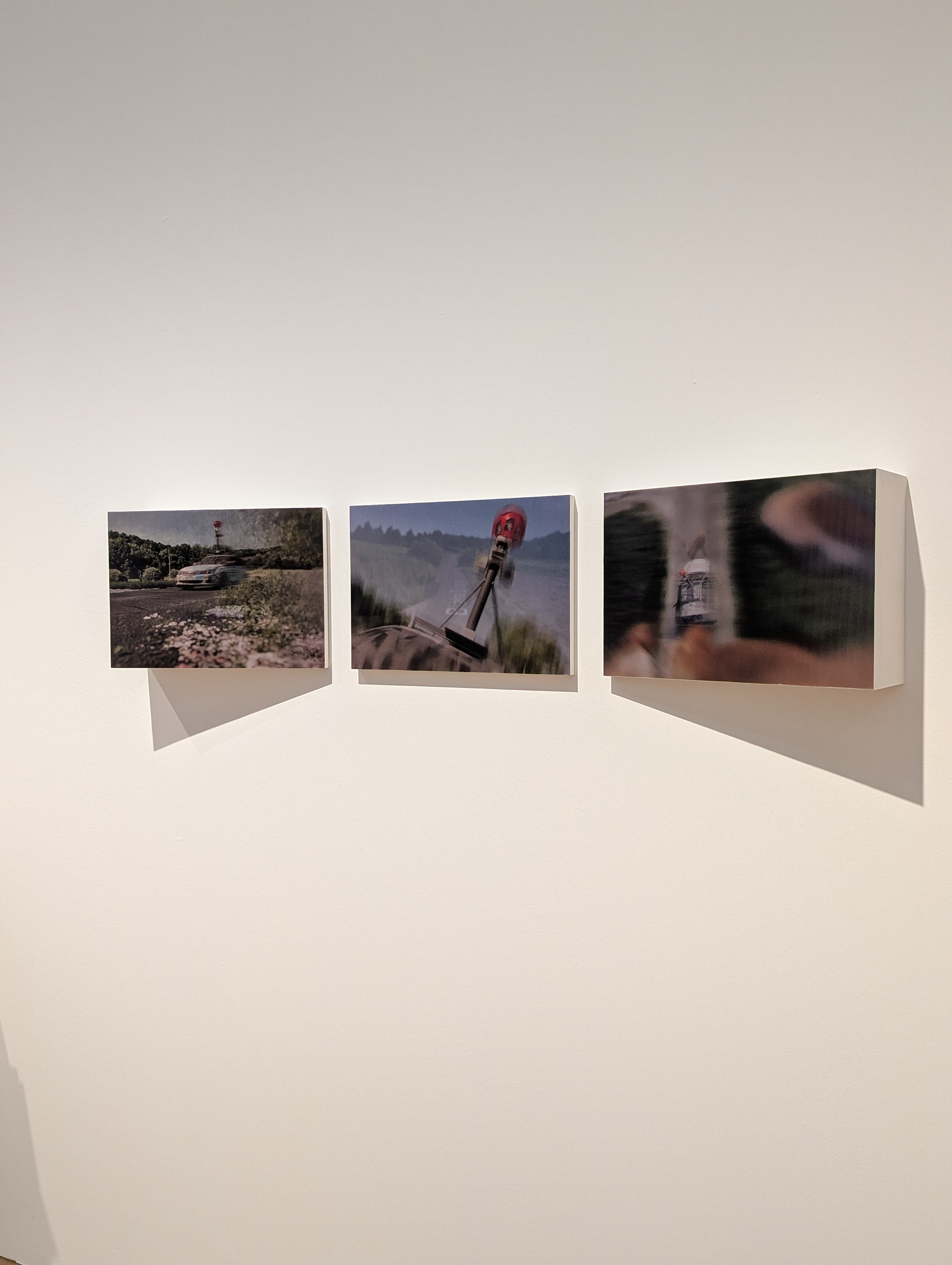 The images are printed as lenticular prints and mounted on angled wooden corpuses. Viewed from the left the three images depict the hare out of the car's perspective. Viewed from the right the hare's point of view is visible.